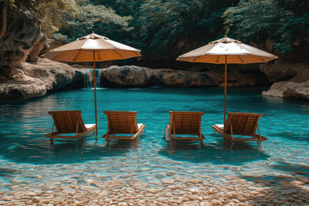 sunbed with umbrella beside the pool professional photography