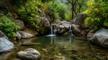 Discover the serene beauty of a mountain stream nestled among lush green trees and enchanting rock formations, offering a peaceful escape into nature's tranquility.