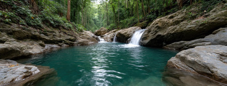 Crystal clear turquoise water flows gently in a jungle pond, fed by a cascading waterfall surrounded by vibrant green vegetation, creating a serene and idyllic natural landscape