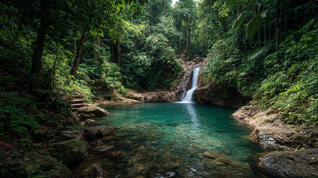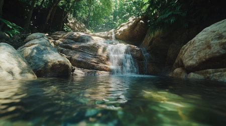 Crystal clear water cascades gently over moss covered rocks, creating a serene waterfall that flows into a tranquil pond, surrounded by the vibrant greenery of a tropical rainforest