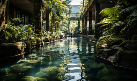 Tranquil tropical rainforest with flowing water and green foliage generated by artificial intelligence