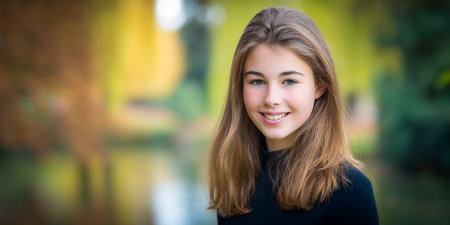 A young girl with long brown hair and green eyes smiles at the camera in front of a blurred background of autumn foliage.