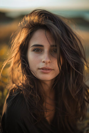 A captivating portrait of a young woman outdoors with long, flowing hair. Her serene expression and soft light create an atmosphere of beauty and tranquility.