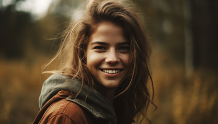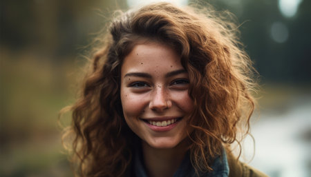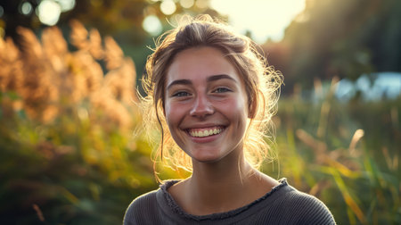 Smiling Young Woman With Wavy Hair in Greenery During Sunset in Autumn