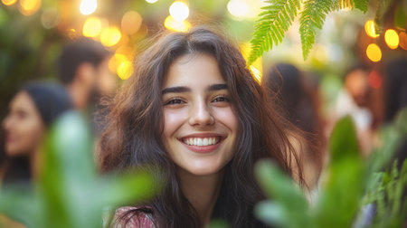 A young woman smiles amid vibrant greenery at a warm, lit evening gathering.