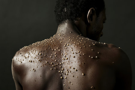 A close-up of a mans back showing skin condition with numerous bumps in a softly lit indoor environment during daytime. Generative AI