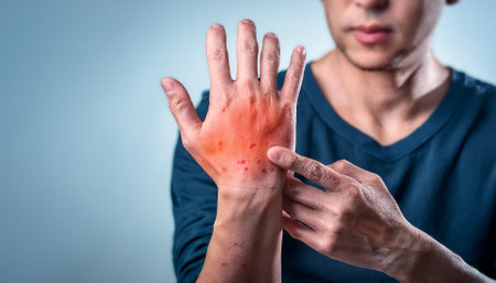 male hand with red skin rash itchy skin allergic response hives chronic psoriasis drug eruption contact dermatitis