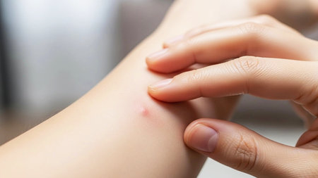 A close-up view captures a healthcare professional gently examining a patients back, which is marked by numerous red spots, indicating a possible skin condition. The gloved hand delicately touches the skin, highlighting the importance of care and attention in medical assessments, while the soft, neutral background suggests a clinical environment.