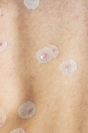 A dermatologist wearing gloves examines the skin of a sick patient. Examination and diagnosis of skin diseases-allergies, psoriasis, eczema, dermatitis. The doctor applies the cream to the skin