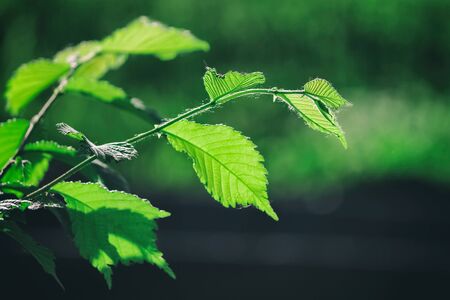 Lush green leaf, purity nature background. Green leaves on elm tree. Nature spring and summer banner. Plants against the blue sky concept. Trees branch isolated on white background.