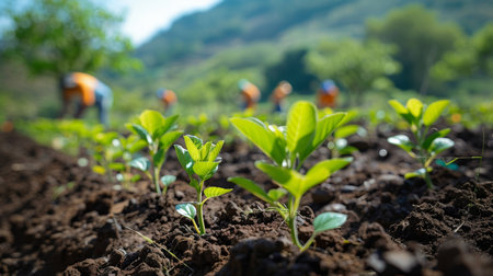 Young plant in the soil with the background of the group of people