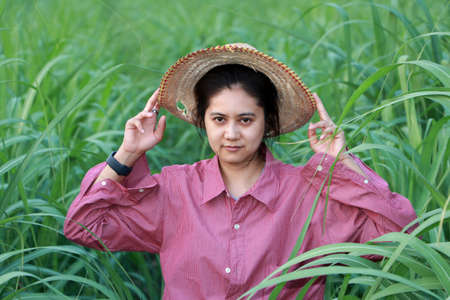 Woman farmer standing in the sugarcane farm and wearing a straw hat with red long-sleeved shirt.