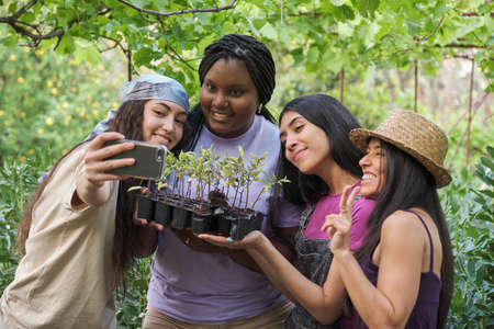 Four multiethnic young female farmers taking a selfie holding tomato seedlings in a seedbed.