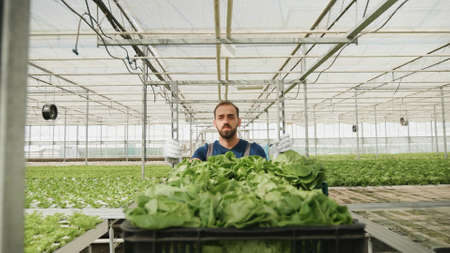 Gardener grower man carrying basket with fresh organic cultivated salad working at vegetable production in greenhouse using hydroponics system during farming season. Concept of agronomy