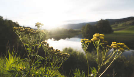 Beautiful summer landscape with mountain river and green meadow at sunset