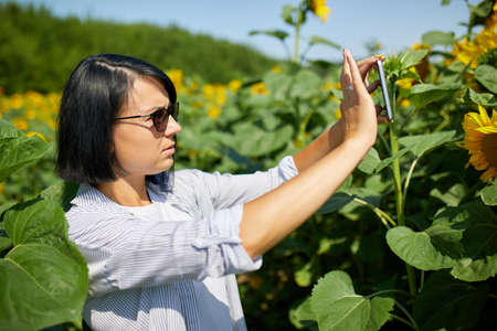 Woman farmer, bussineswoman take photo on tablet field Organic sunflower, sales online, growing seeds for production of vegetable oil. Smart farming digital agriculture, modern technology