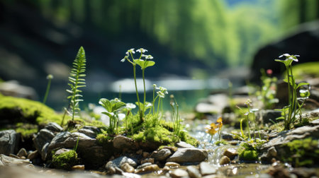 Close up stream of fresh water with young green plants. Spring nature concept. Generative AI