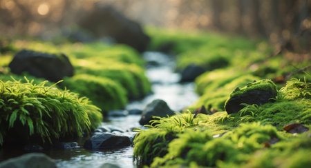 AI Generated. Tranquil Stream Flowing Through Lush Green Moss