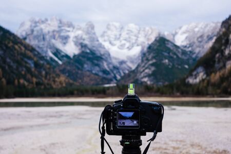 Digital camera on tripod capturing mountain landscape