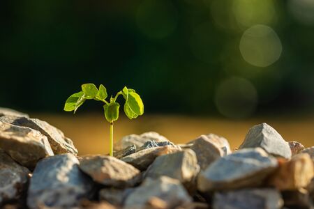 Young green sprout growing in soil pile of rock on green blur background. Growing and environment concept