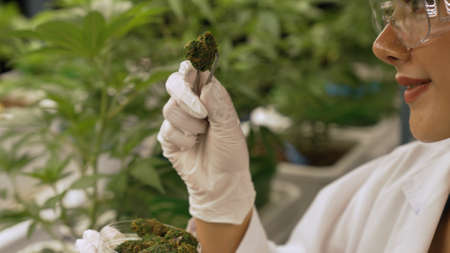 Scientist test cannabis product in curative indoor cannabis farm with scientific equipment before harvesting to produce cannabis products