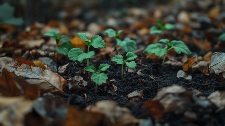 A close-up of small green saplings growing in dark, rich soil, surrounded by fallen leaves, symbolizing the start of a reforestation effort