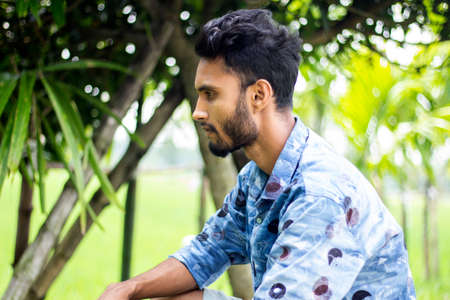 A young asian indian boy looking at the other side in front of natural background with blue check shirt