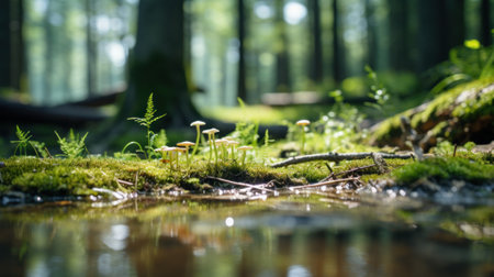 A small group of mushrooms growing on the ground near a stream, AI