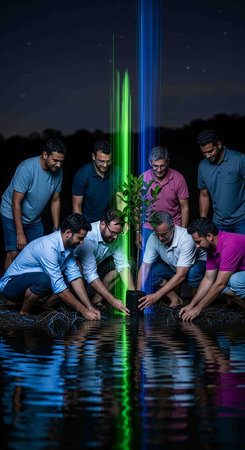A lush green landscape with young trees being planted by volunteers, showcasing efforts in land restoration
