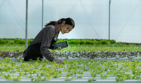The farmers in modern hydroponic vegetable fields. Farmer working in hydroponic farm.