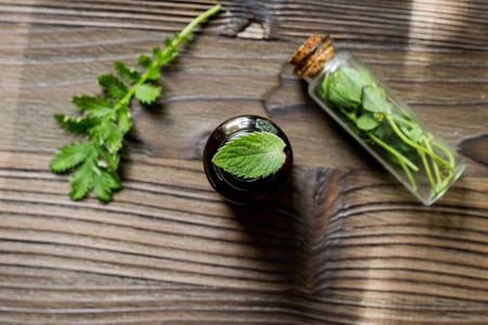 Essential oils and herbal extracts in small bottles. Selective focus. nature.