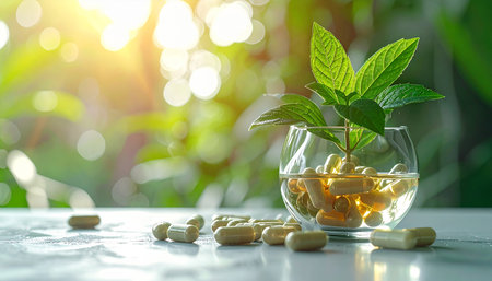 Herbal capsules rest surrounded by vibrant greenery, showcasing a serene and tranquil atmosphere that highlights nature's abundance and wellness.