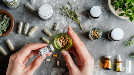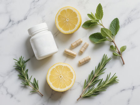 Fresh herbs, supplements, and natural ingredients arranged beautifully, promoting health and wellness in a bright kitchen setting.