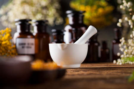 Alternative medicine. Store up medicinal herbs. Herbs in glass on wooden table background.