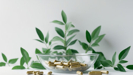 AI Generated. Herbal Capsules in Glass Bowl - Holistic Health Supplement