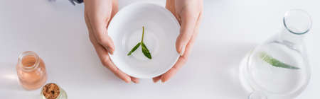 top view of laboratory assistant holding bowl with mint leaves near flask and bottles, banner