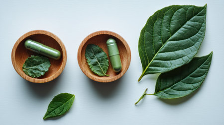 Herbal capsules and fresh leaves in wooden bowls highlight natural health choices