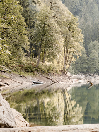 Clean and calm forest lake surrounded by trees on a warm sunny day. Nature reserve. National park