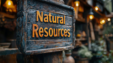 A close-up of a rustic wooden sign with the words 'Natural Resources' in a natural, outdoor setting. The atmosphere is warm and inviting, with glowing lights in the background.