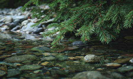 A tree branch is in the water. The water is clear and the rocks are scattered around. The branch is green and has leaves