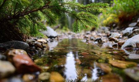 A stream of water is flowing through a rocky area. The water is clear and the rocks are scattered throughout the area
