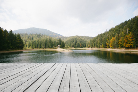A wooden deck extends over a serene mountain landscape featuring a lake and surrounding trees. The scene has a natural color palette, with greens, browns, and the soft light of the day. The composition has a sense of depth and tranquility creating a peaceful atmosphere.