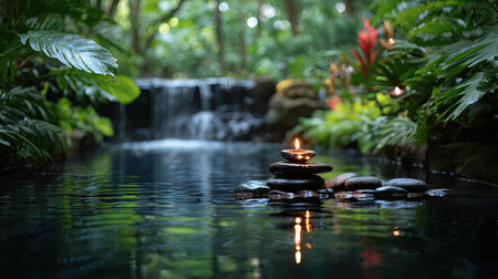 A serene scene features a small waterfall cascading into a still body of water. A stack of dark stones holds a lit candle, reflecting in the water's surface. Lush green foliage surrounds the water. The composition, with its soft focus and natural lighting, suggests uses for relaxation or wellness projects.
