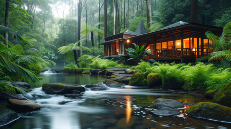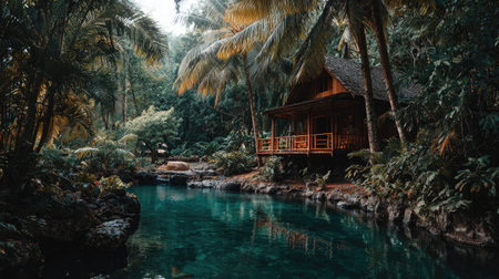 This tranquil image captures a beautiful tropical retreat nestled in lush greenery, surrounded by clear waters in a peaceful forest setting. Perfect for relaxation.