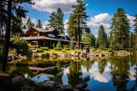 Tranquil scene of green forest reflects in pond generated by artificial intelligence