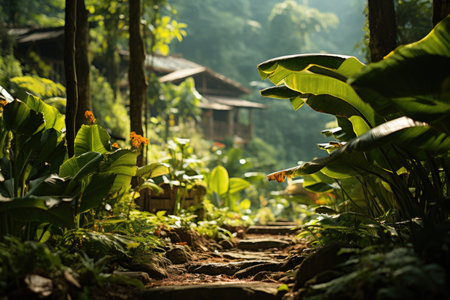 A forest scene with a forest and a banana leaf, generative AI
