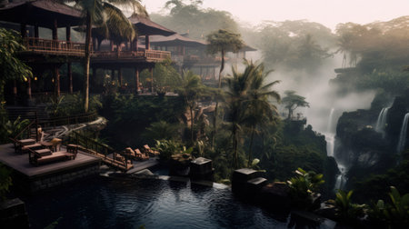 A stunning image of a resort pool nestled in the heart of the Balinese jungle. The misty atmosphere creates an ethereal feeling, while the earthy tones and bold traditional design of the cottages add a touch of rustic charm. Surrounded by mountainous vistas, this is the ultimate escape into nature.