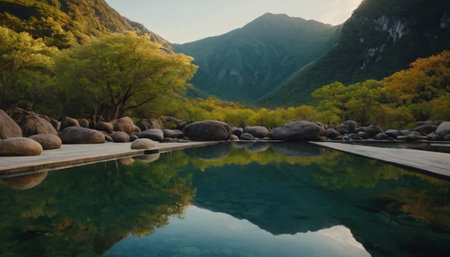 A body of water surrounded by trees and mountains. AI generative image.