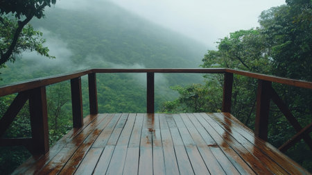 A serene wooden deck offers a breathtaking misty forest view. The lush greenery and fog create a peaceful atmosphere, perfect for relaxation and contemplation.