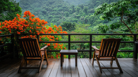 Resort balcony setup featuring two comfortable wooden chairs, a table, and the vibrant greenery of the surrounding garden in full bloom.